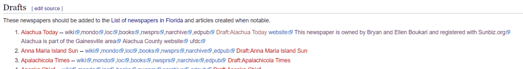 To summarize the edits I made, I replaced the wiki and mondo links with the specific pages within the search results about the newspaper. I also found other sources to help create the page, such as the newspaper’s website (to be linked to on the article page), facts about the owners and area where the newspaper was located, as well as business records. A page already exists for this paper, but it is only a stub, so hopefully someone can come along and use the information I found to create a more robust article.