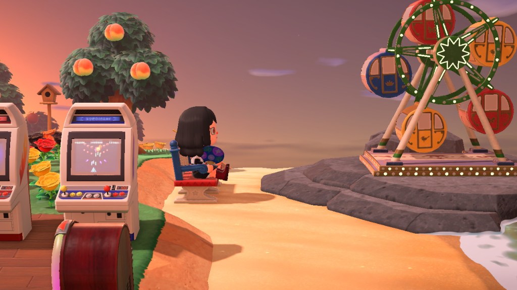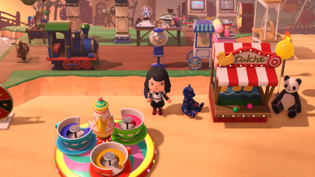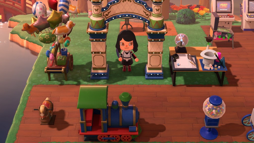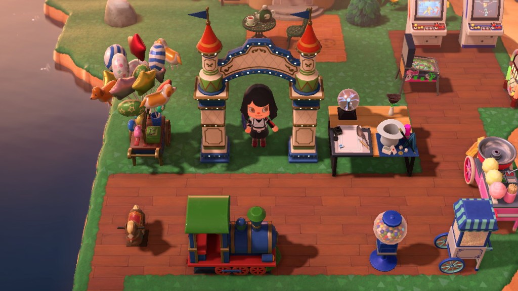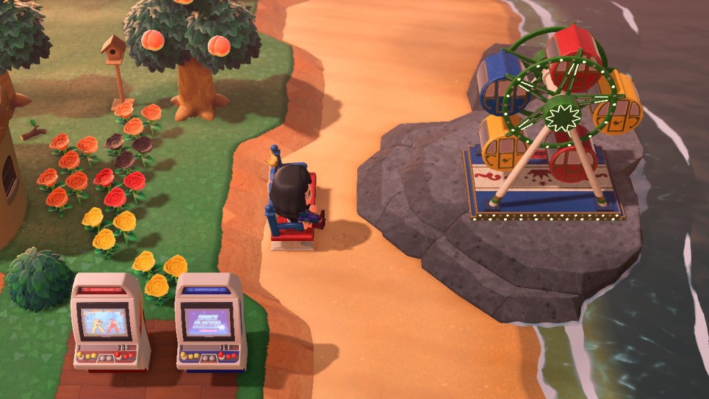 On the larger shore area of my island, I’ve created a beachside carnival/fairground area with the carousel, teacups, ferris wheel, and other fair life staples. I made it look like a boardwalk with wooden slats leading to the gaming area, set up with arcade games and a pinball machine. And of course, no carnival is complete with cotton candy and popcorn stalls.