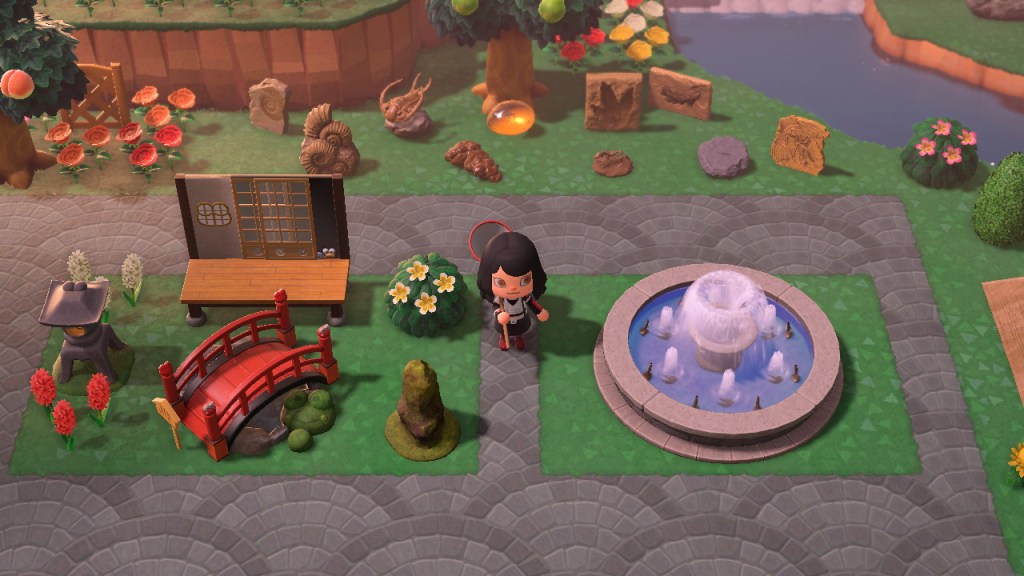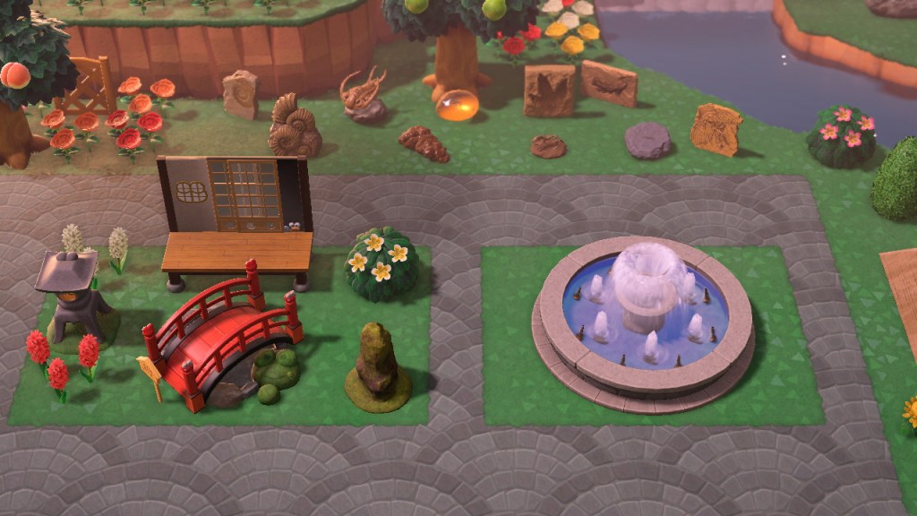 I set up mini gardens around most of the homes, as well as a larger backyard garden behind mine. In another spot, I created a large park area with the “monster statue”, a small fossil exhibit, fountain, and pyramid to look similar to a public park.