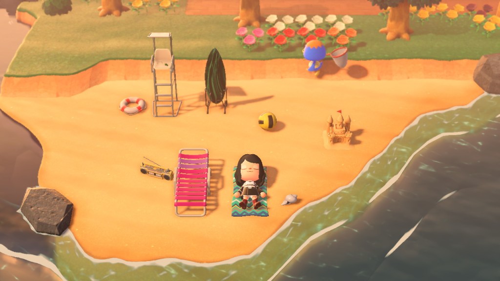 On one of the shore sections, I put out the lifeguard chair, surfboard, a beach chair, volleyball, beach towel, and lifesaver to create a small public beach area. Complete with a sandcastle, it’s the perfect place for my villagers to relax on the sand.