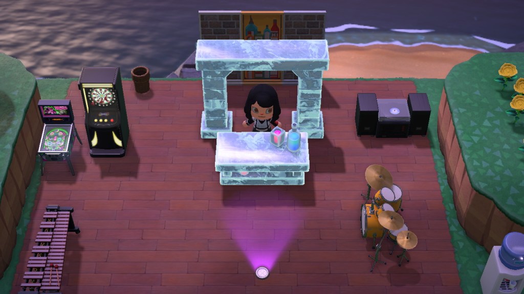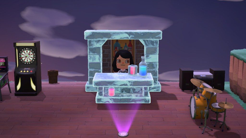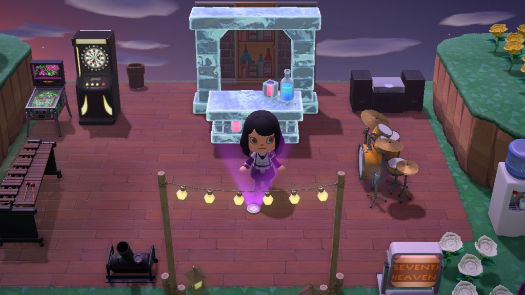I’ve been recreating the Seventh Heaven bar from Final Fantasy 7 with DIY recipes like the ice counter and arch, as well as a pinball machine and dartboard. I even made a custom design for the sign.