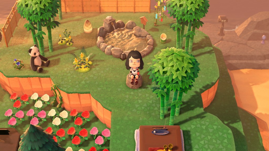 On one of the topmost areas of the island, I’ve been creating a zen area complete with bamboo trees, an outdoor bath, kotatsu, and other Asian-inspired elements. I used the bamboo fencing to enclose the space so it looks like a true hot springs, and placed a panda bear plus paper tiger.