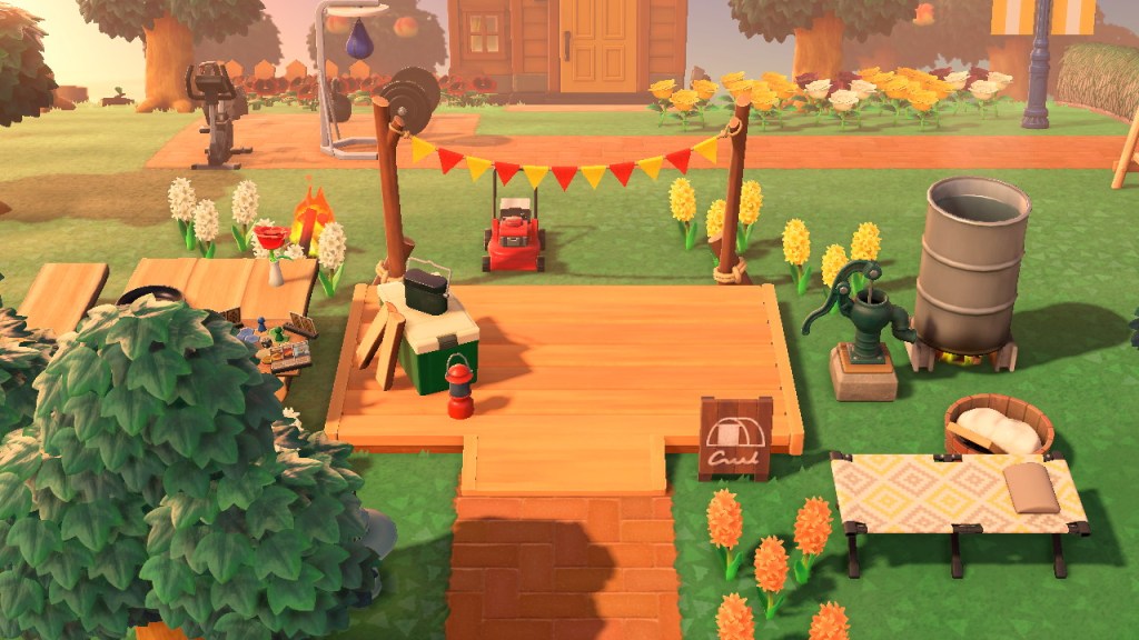 My girlfriend gave me the idea for this one: expanding the campsite with gear such as lamps, a fireplace, hammock bed, laundry area, and more! I also set up a smaller camping area with a sleeping bag on a tiny section of the island separated by rivers and waterfalls for a truly outdoorsy feel.