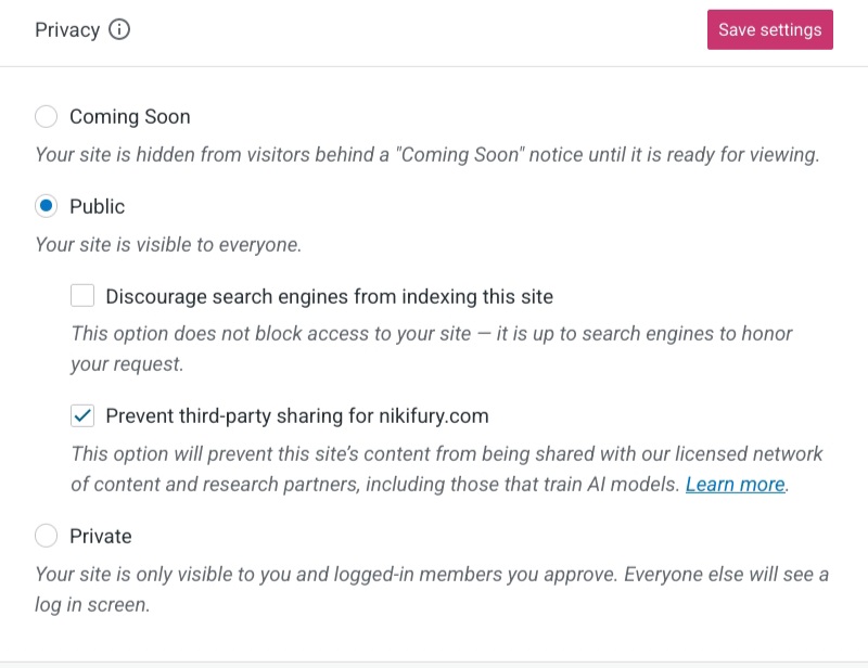 From your admin dashboard, navigate to settings -> general and scroll down to see the privacy options. You can display a “Coming soon” page while working on your site, set it to private so only logged in users can see it, or have it public. When set to public, you have the option to opt out of search results (if you don’t want your site to be found through a query) and/or opt out of data scraping for third parties. Note that both of these options say “discourage” and leaves it up to third parties like search engines and AI companies to honor the request. This isn’t a guarantee that your blog won’t appear in search results or be fed to AI machines, so you may want to take extra precautions and additional security measures.