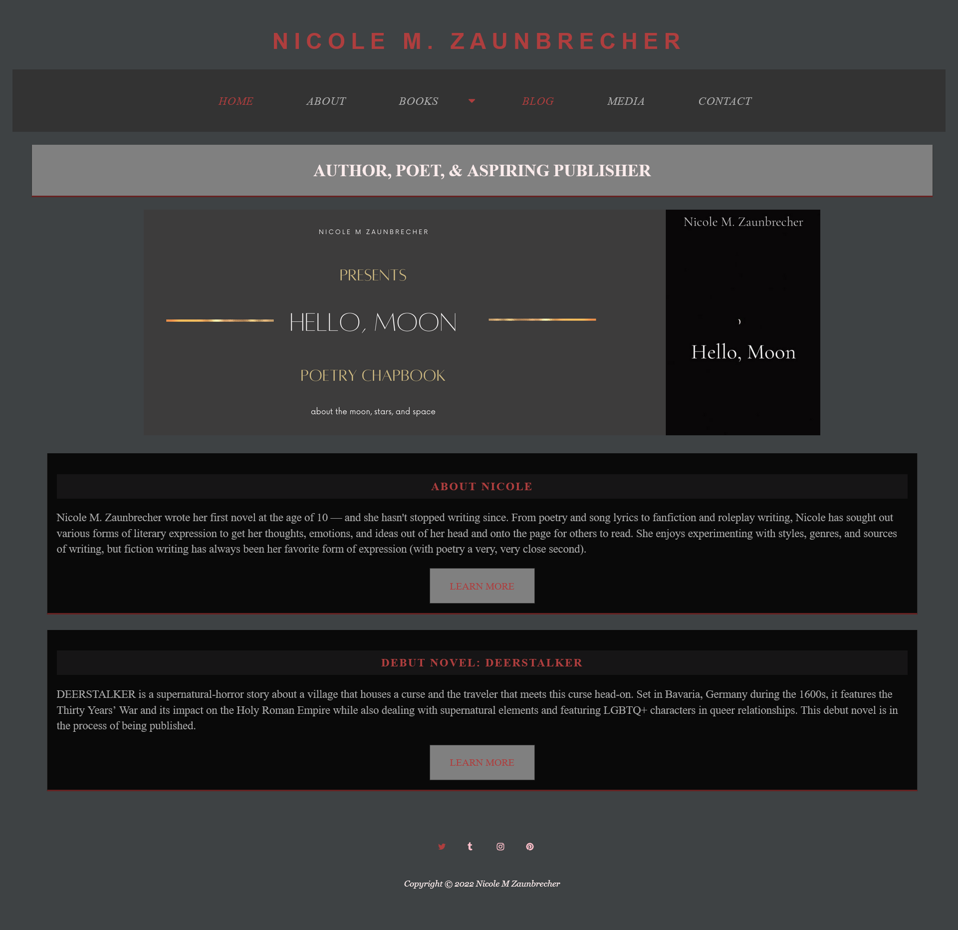 I created my author website, nicolemzaunbrecherauthor.com, using Glitch as a staging area to utilize my HTML and CSS coding skills. It was originally hosted on WordPress and is now being hosted by Wix.